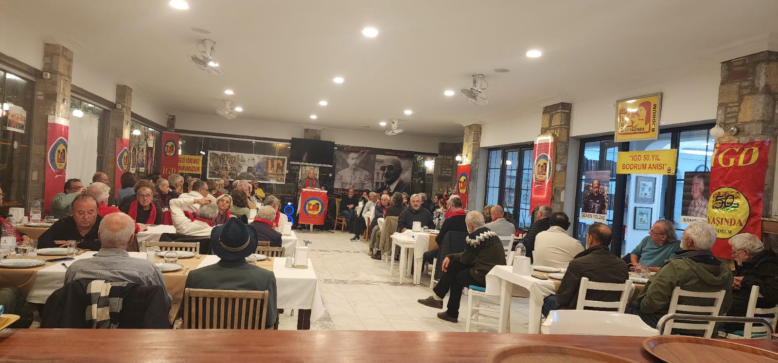 Bodrum’da 10 yıldır İGD’nin kuruluş yıldönümleri kutlanıyor. Geleneksel hale gelen bu etkinliğin 50. kuruluş yıldönümüne denk gelmesi ayrıca bir özgün çalışmaya neden oldu. Bitez Toloman Otel’de yemek organizasyonu olarak düzenlenen ve mücadelede yaşamını yitirmiş tüm devrimcilerin anısı önünde saygı duruşu ile başlayan etkinlik hayli renkli görüntülere sahne oldu. Sunuculuğunu Beyhan Erel’in yaptığı gecede adeta konser havasında bir müzik ziyafeti gerçekleştirildi. Solist Olarak Fatma Özsoy’un yer aldığı sahnede, klarneti ile Göksun Doğan, bağlaması ile Bülent Özsoy, gitarı ile Seyfi Yılmaz katılımcılara unutulmaz ve hayli keyifli anlar yaşattılar. Doğal olarak marşlar ve türküler geceden eksik olmadılar. Geceye Almanya’dan katılan Hüseyin Ertuğtul da Nazım Hikmet’ten okuduğu şiirlerle duygusal anlar yaşanmasında etkili oldu. 1980 öncesi Halkın Kurtuluşu, Halkın Yolu, Devrimci Yol, Kurtuluş, Genç Öncü olarak bilinen gençlik örgütlerinde çalışma yapmış bireylerin de katıldığı etkinliğin onur konuğu Alaattin Taş oldu. Alaattin Taş, İlerici Gençler Derneği’nin Genel sekreteri ve 1980 öncesi gençlik hareketinin sembol isimlerinden idi. Halen politik etkinliklerde aktif olarak yer alan Taş gecenin tek konuşmacısı idi.