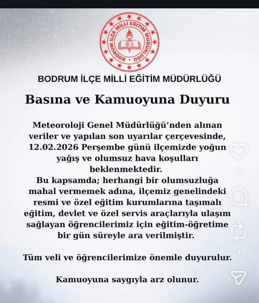 Bodrum İlçe Milli Eğitim Müdürlüğü, beklenen olumsuz hava koşulları nedeniyle 12 Şubat Perşembe günü taşımalı eğitim kapsamındaki öğrenciler için eğitime bir gün ara verildiğini duyurdu.