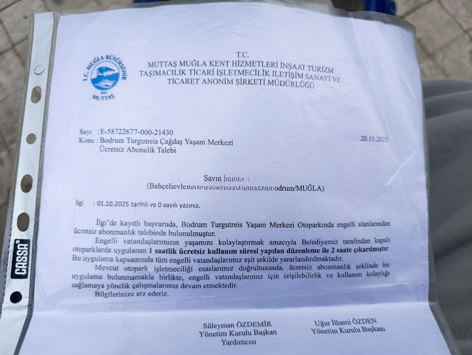 Muğla Büyükşehir Belediyesi iştiraki MUTTAŞ tarafından işletilen Turgutreis Yaşam Merkezi otoparkı, engelli bir vatandaşın "ücretsiz abonelik" talebine verilen yanıtla gündemde.