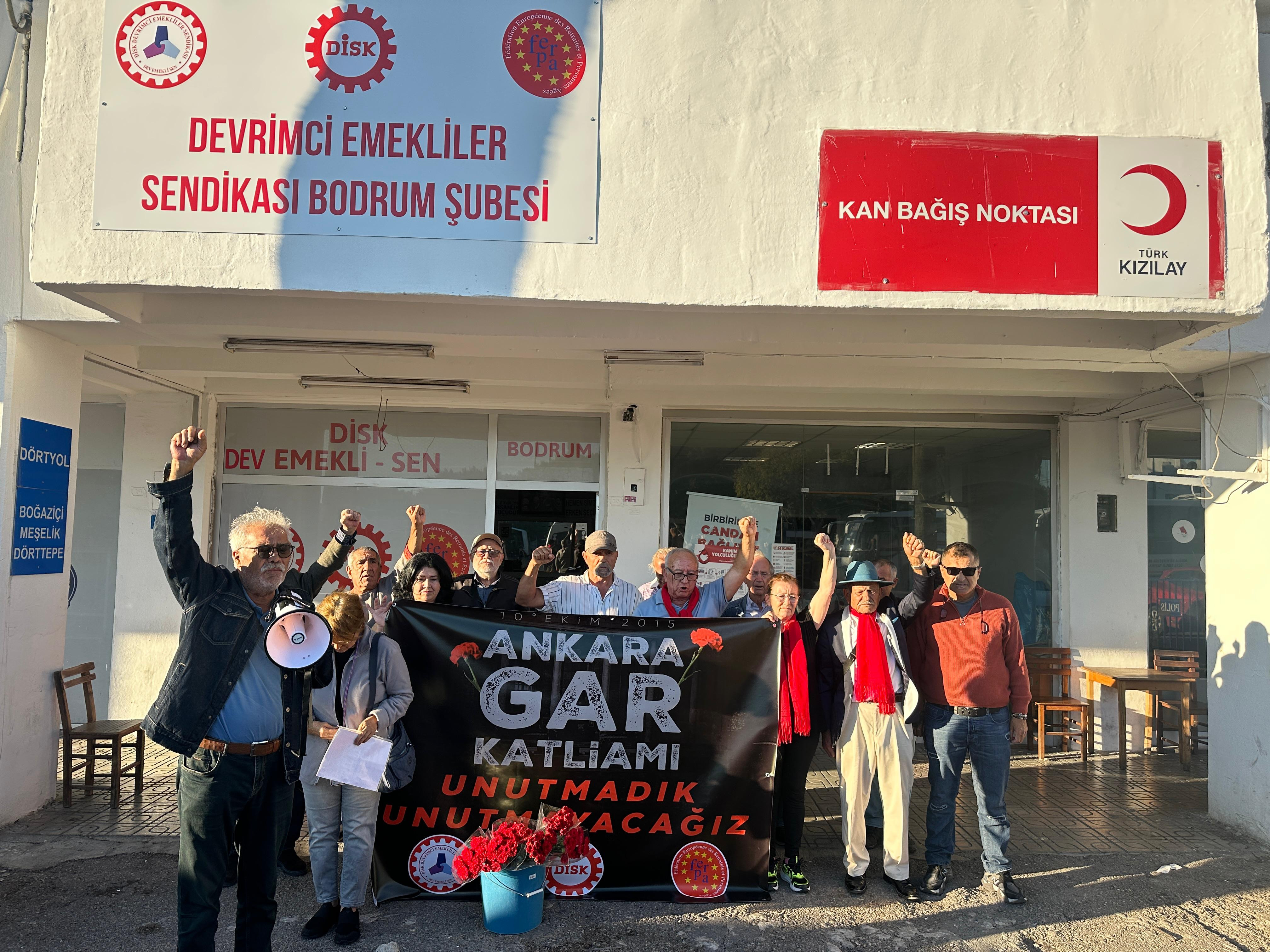 DİSK-Devrimci Emekli Sen tarafından, Bodrum Eski Garaj’da gerçekleştirilen eylemle saldırı kınanırken, 10 yıl önce Ankara Garı’nda yaşamlarını kaybedenler anıldı. Anma da ilk sözü alan İbrahim Uzun; “Biz 10 yıl önce katledilen yüce değerlerimizin izinde yürüyoruz. Faşizm gene kaybetti. Bizi davamızdan ve mücadelemizden vazgeçiremedi. 10 Ekim 2015’de katledildiğinde 9 yaşında olan Veysel Atılgan’ın hesabını mahşere bırakmayacağız. Bugün Bodrum Belediye Başkanlığı’na dilekçe vererek, “10 Ekim Özgürlük Ve Barış Anıtı” talebinde bulunduk. Bunun için ressamların, heykeltraşların, mimarların katılacağı görsel tasarım yarışması düzenlenmesinin de pek ala olası olduğunu bildirdik. Yer önerimiz ise Bitez Mahallesi’ndeki, “Üç Fidan Parkı” oldu. Eyleme garajda bulunan pek çok yurttaş da destek verdi. Turgutreisli Zeynep Orçun; “DİSK’in yaptığı bu anlamlı etkinliğe tesadüfen tanık oldum ve katıldım. 10 Ekim Özgürlük Ve Barış Anıtı çabasını çok kıymetli buldum. Bu mutlaka hayata geçirilmeli. Bodrum’dan ülkeye çok da yerinde bir mesaj verilmiş olur” ifadelerini kullandı.