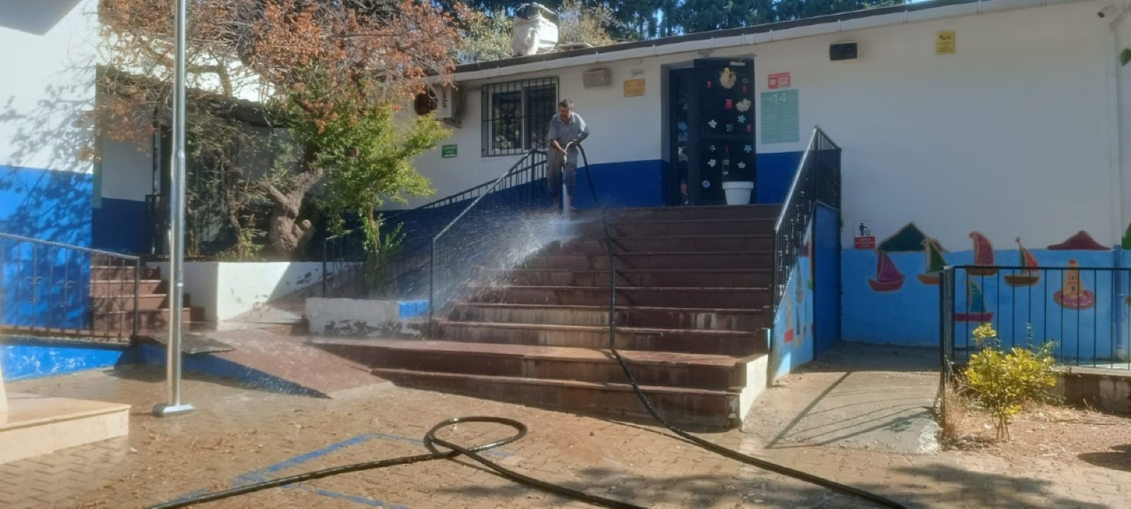 Belediye ekipleri tarafından ilçenin farklı mahallelerinde yürütülen çalışmalarda, ihtiyaç duyulan okullarda fiziki iyileştirmelerin yanı sıra genel temizlik, peyzaj düzenlemesi ve budama çalışmaları da yapılıyor.