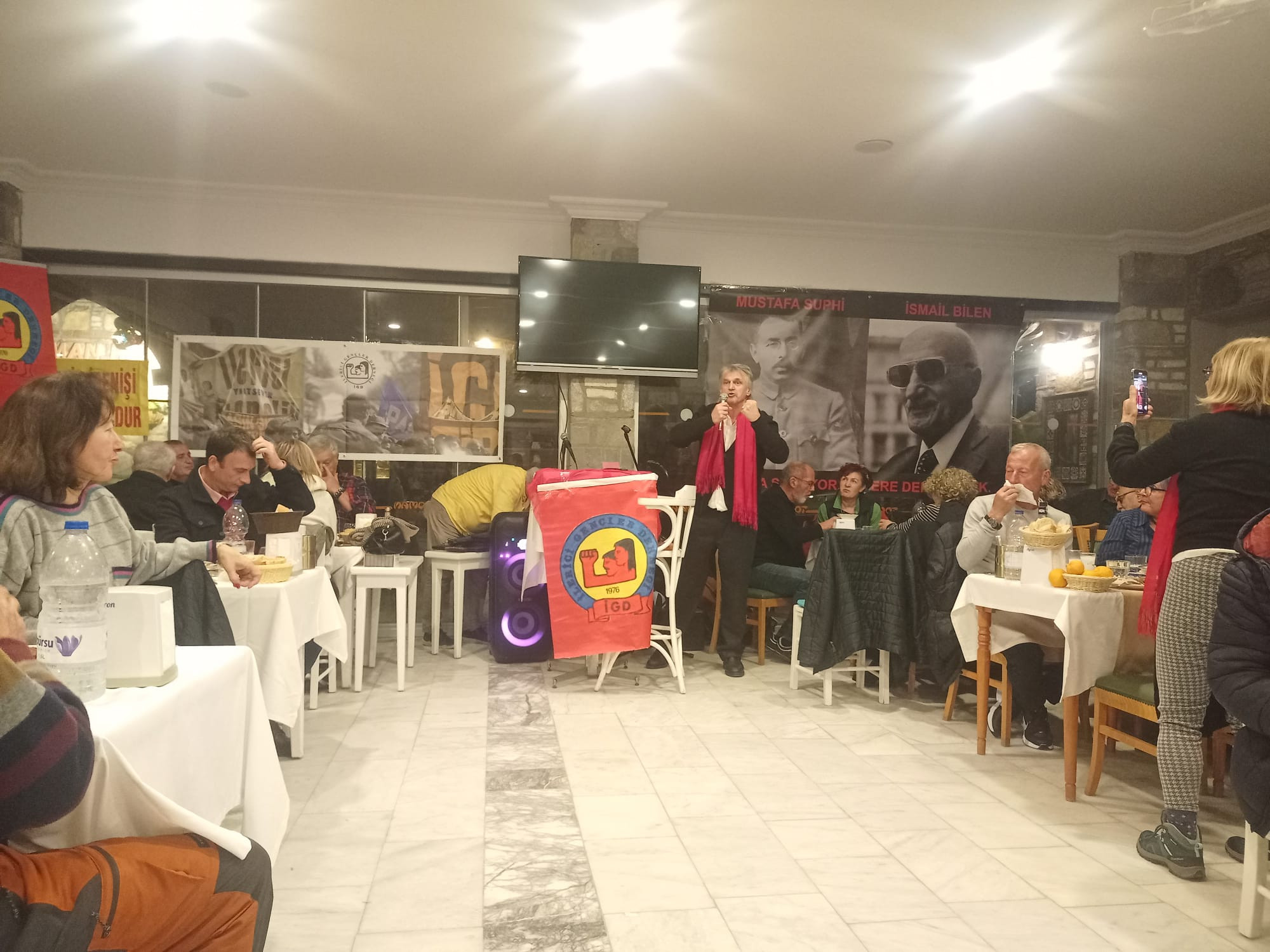 Taş 50. Kuruluş yıldönümünde bir araya gelen 150 civarındaki katılımcıya hitaben yaptığı konuşmada: “Anlaşıldığı gibi sadece 1973-1980 arası değil, 1920’de başlayan ve devam eden bir mücadele tarihinden söz ediyoruz. Gençtik, umutluyduk, tez canlıydık, arkamıza bakmadan koşanlardık. Coplara, kurşunlara, işkencelere rağmen durmadık, eğilmedik, onurumuzu, çiğnetmedik. Elbette düşenlerimiz, ayrılanlarımız, yanlışlarımız oldu. Ancak mücadele durmadı. Spordan, sanata, kadın hareketine, sınıf mücadelesine, Kürt sorununa değin hiçbir şeye kayıtsız kalmadık. Eksiklerimiz oldu elbette. Eylem biriliği için yeterince çaba harcamadık. Kürt gençliğini anlamada eksik kaldık. Sekter eğilimlere engel olamadık. Edindiğimiz ulusal ve uluslar arası tecrübeler ışığında daha eleştirel ve özeleştirel olabilmeliydik. Değerli dostlar, yoldaşlar. Hayat devam ediyor. Otoriter rejiler dünya için tehdit oluşturuyor. ABD’nin başını çektiği sistem; daha çok silah, daha çok şiddet diyor. İsrail Ortadoğu’yu ateşe veriyor. Kürt sorunu çözüm bekliyor. Hukukun üstünlüğü, yargı bağımsızlığı aranır oldu. Ekonomik sıkıntılar, işsizlik, çalışanların yaşam mücadelesi işkenceye dönüştü. Kadın cinayetleri, silahlanma ve suç oranı devasa arttı. Irkçılık büyüdü. Ekolojik felaketler, iklimsel değişiklikler yer küreyi ve yaşamı sarsmaya başladı. Ancak barış, demokrasi, değişim ve özgürlük mücadelemiz devam ediyor. TKP ve işçi sınıfının yolunda olan İGD’nin sıra neferi olmaktan gurur duyuyor, 50. yılımızı kutluyorum” ifadelerine yer verdi.