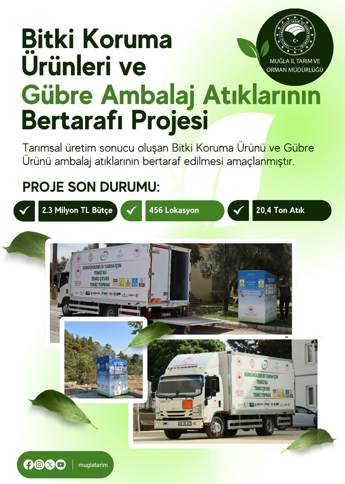 Muğla Tarım ve Orman Müdürlüğü’nün, “Bitki Koruma Ürünleri ve Gübre Ambalaj Atıklarının Bertarafı” projesi ile ilimizde bugüne kadar yapılan çalışmalarla 13 ilçemizde, 456 lokasyona yerleştirilen konteynerlerde 20,4 ton atık toplanmıştır. Bu sebeple İl Müdürlüğümüzün çevresel sürdürülebilirlik, doğal kaynakların korunması ve atık yönetimi konularında yürüttüğü çalışmaların, ilin çevre vizyonuna önemli katkı sağladığı ifade edildi.