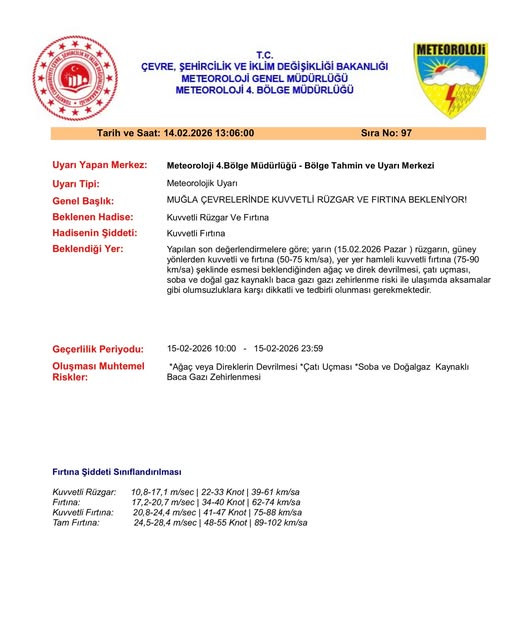 Meteoroloji Genel Müdürlüğü 4. Bölge Müdürlüğü, Muğla ve çevresi için kritik bir hava durumu uyarısı yayımladı. Yapılan son değerlendirmelere göre, bölgede yarın sabah saatlerinden itibaren şiddetli rüzgar ve fırtına etkili olacak.