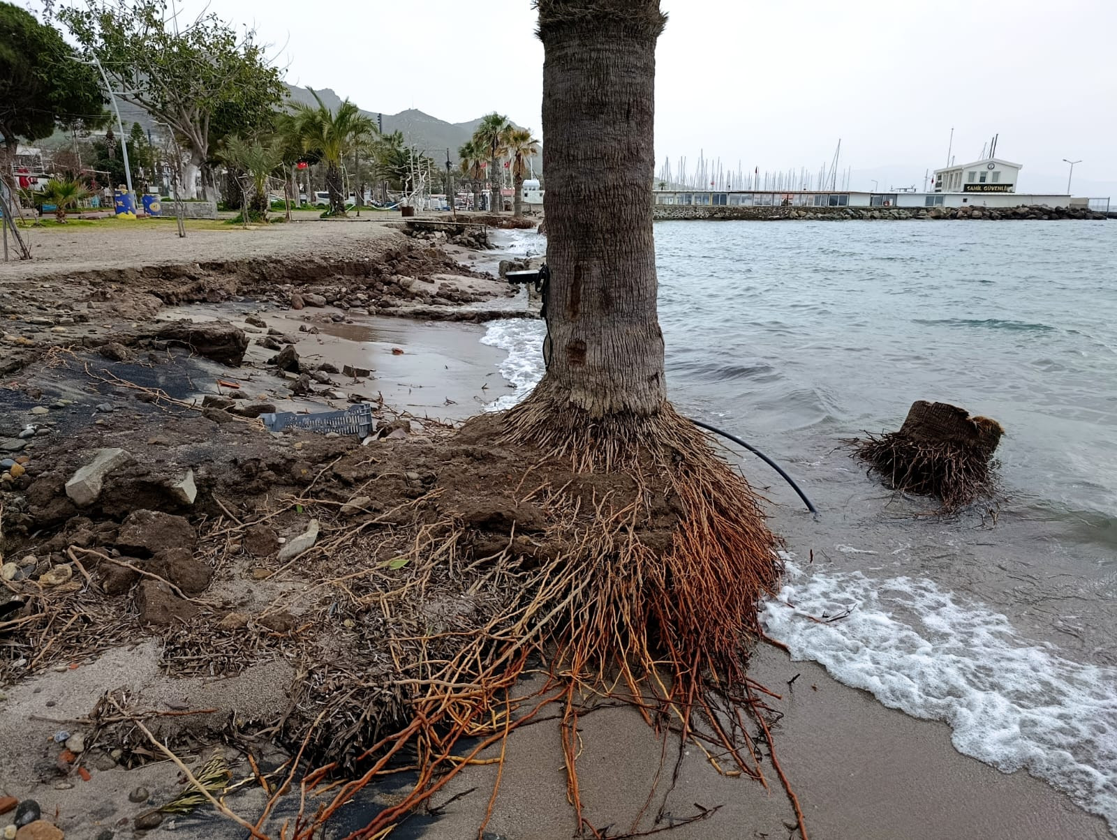 Kıyı erozyonu sadece yapıları değil, doğayı da vurdu. Sahildeki ağaçlar köklerinden sökülerek devrildi.